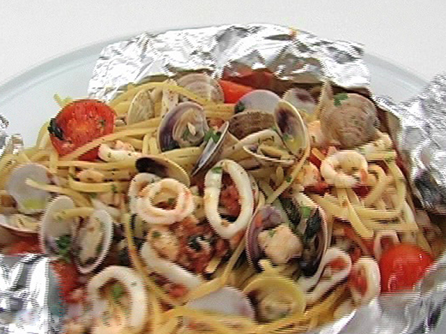Для всех почитателей итальянской кухни.Состав:кальмары — 150-200 гр;паста — 100 гр;рыбный бульон — 150 гр;филе морского ангела — 100 гр;помидоры — 2 штуки;белое вино — 1/3 стакана;чеснок — 2 зубчика;петрушка — 1 столовая ложка;мидии — 12 штук;помидоры черри — 4 штуки;оливковое масло, свежий базилик, черный перец, морская соль — по вкусу.
