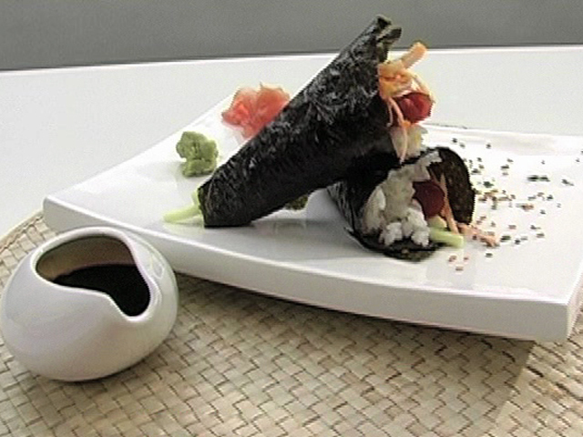 Взрывной вкус подарит «Динамит».Состав:тесто гиоза — 2 листочка;рис — 30 гр;огурец — 1 штука;тунец — 60 гр;острый соус — 1/2 листа;сливочный сыр — 1 столовая ложка;крабовое мясо — 2 кусочка;острый соус, майонез, икра тобико — по вкусу.